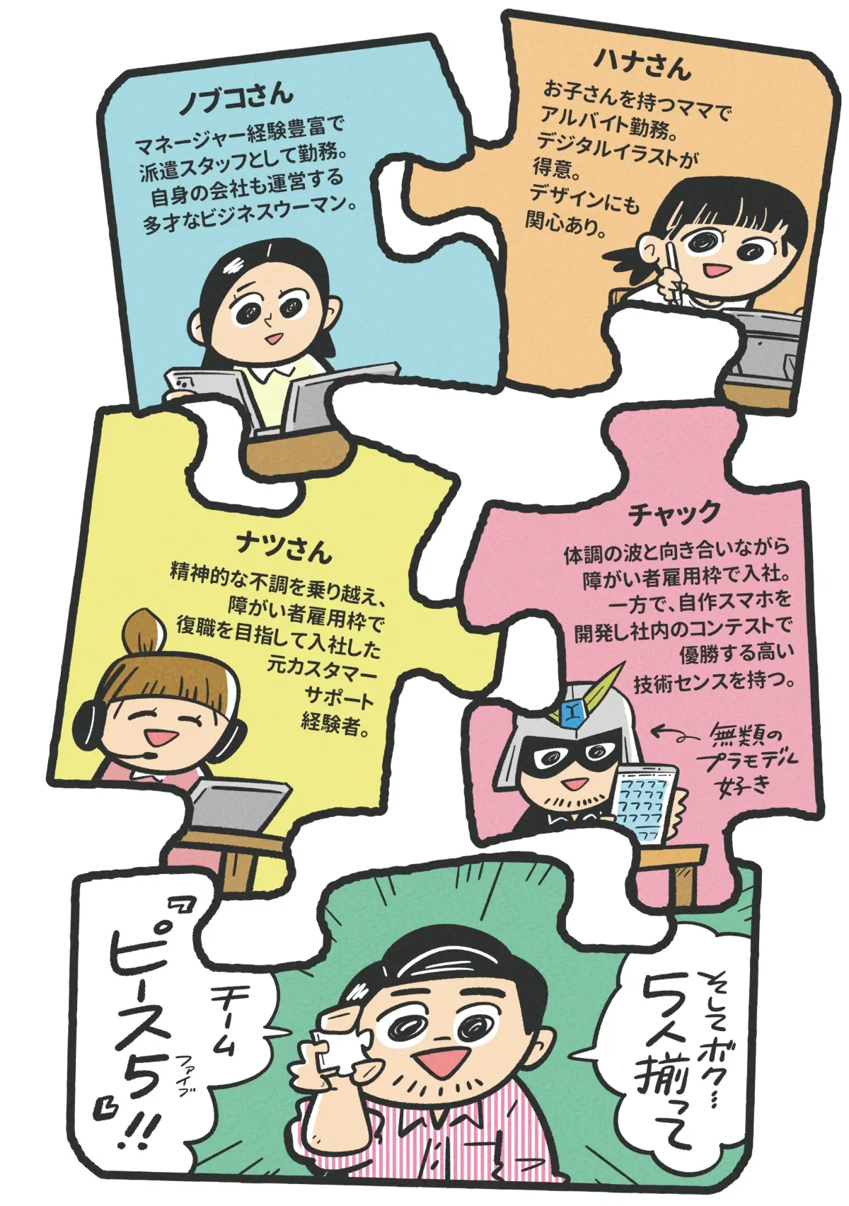 らふてー以外の4人はスカウト業務未経験者。アルバイトや障がい者雇用枠で人事アシスタントを勤めており、声をかけられた本人たちも重要な任務に戸惑った。