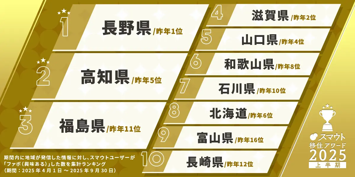 【人気移住先ランキング】約8万人のユーザーから興味を集めた『スマウト移住アワード2025上半期』結果発表