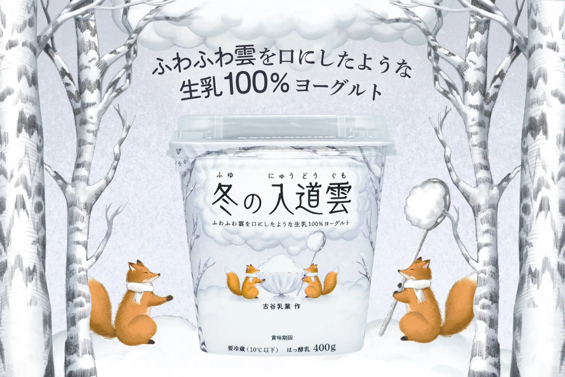 「冬の入道雲」は、古谷乳業とカヤックが共同開発した「物語のあるヨーグルト」シリーズのひとつです。古谷乳業とのコラボレーション初作となる「ミルクの束縛」が関東甲信越エリアで累計130万本を超えるなど、大きな支持を得たことを受け、ヨーグルトシリーズが始動。「食べる絵本」という世界観を形にしました。
