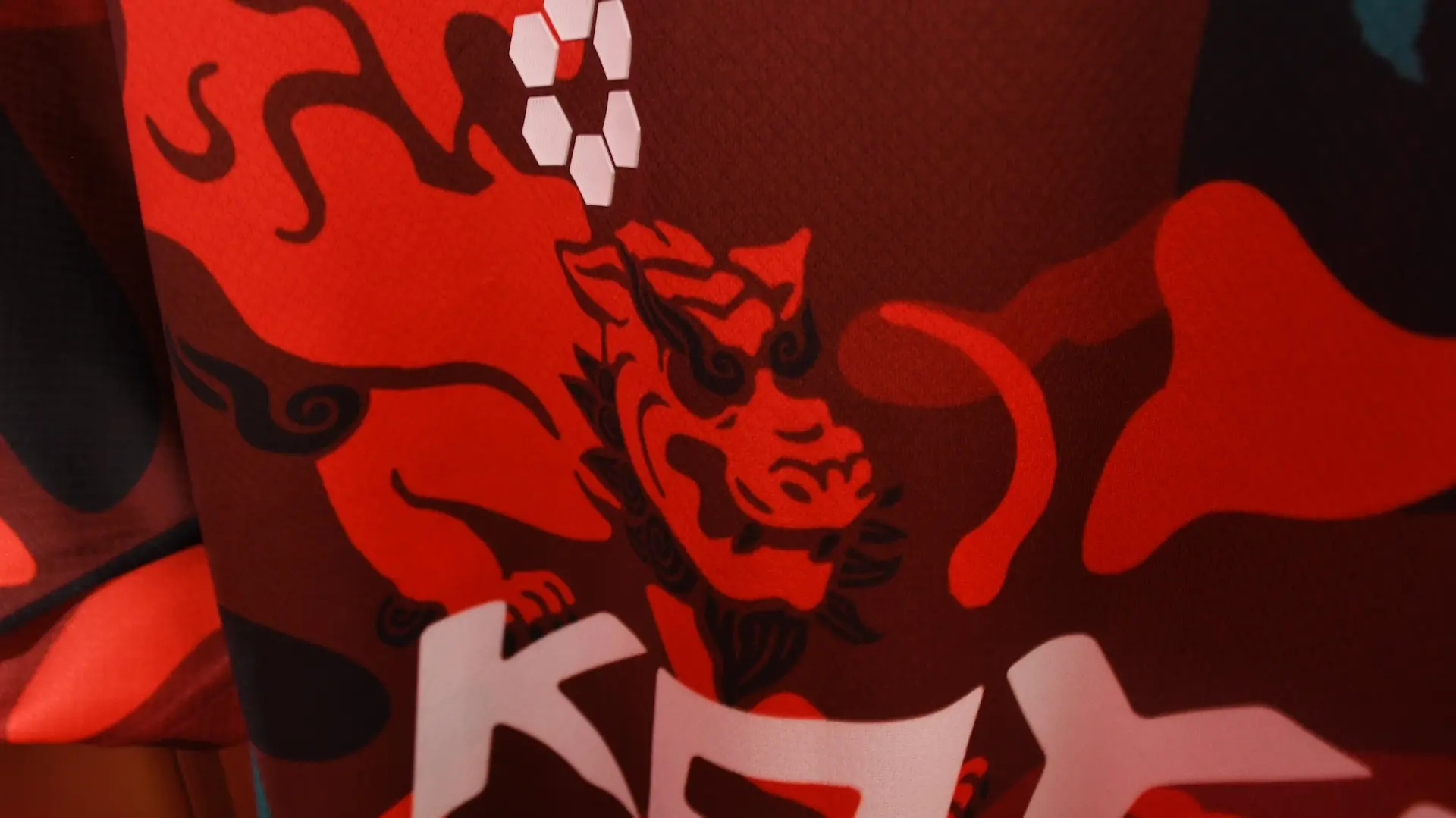 琉球の守り神であるシーサーが、まるでユニフォームというフィールドを縦横無尽に駆け回るかのように配置されています。単なるモチーフではなく「戦う存在」として、どんな相手にも立ち向かう強さや躍動感を描いている点が、今回のデザインの肝となっています。