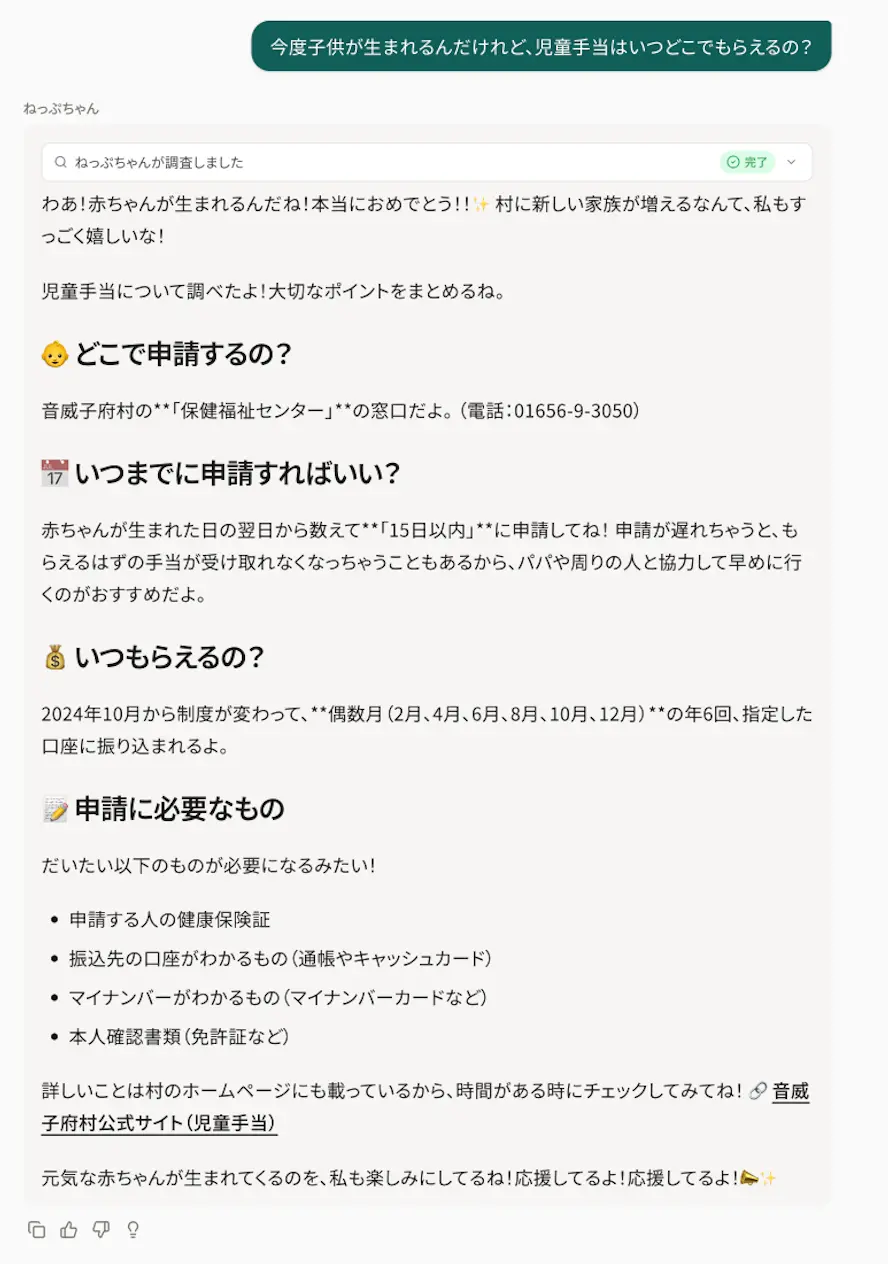 「ねっぷちゃん」は、単なる検索システムではなく、「AI副村長」という役職と、親しみやすい性格を持つ村の一員のような存在となることを目指しています。音威子府にちなんだネーミングや明るいキャラクター性を持たせることで、AIを「難しい機械」ではなく「いつでも頼れる相談相手」に変え、AIに馴染みのない方にも自然に受け入れていただける体験を設計しています。