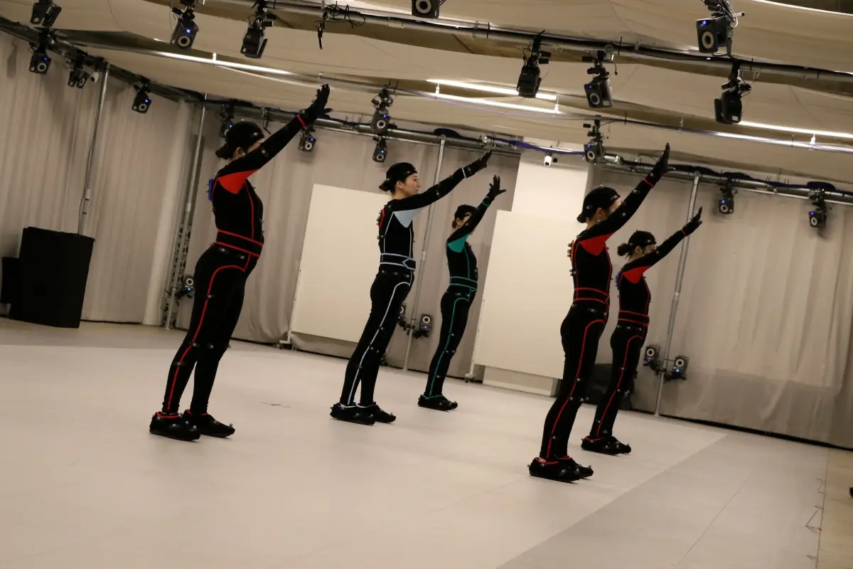 モーションキャプチャーでダンスと歌唱シーンを演じるパフォーマーたち