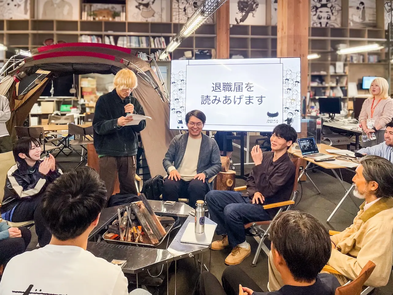 焚き火で和やかな雰囲気のなか、退職届を読みます今回は、キャンプ用品を活用したオフィス支援を行うスノーピークビジネスソリューションズ(スノーピークBS)さんの協力のもと、社屋内のフリースペースを「キャンピングオフィス」にリニューアル。