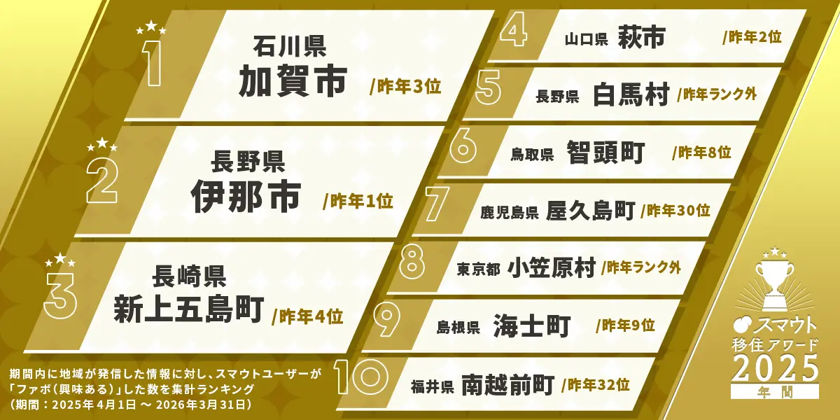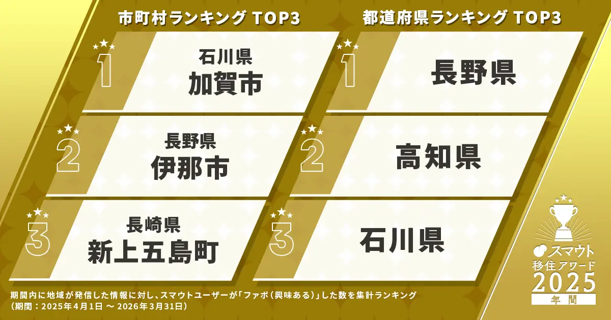 【人気移住先ランキング】約9万人のユーザーから興味を集めた『スマウト移住アワード2025』年間結果発表―加賀市が初の頂点に