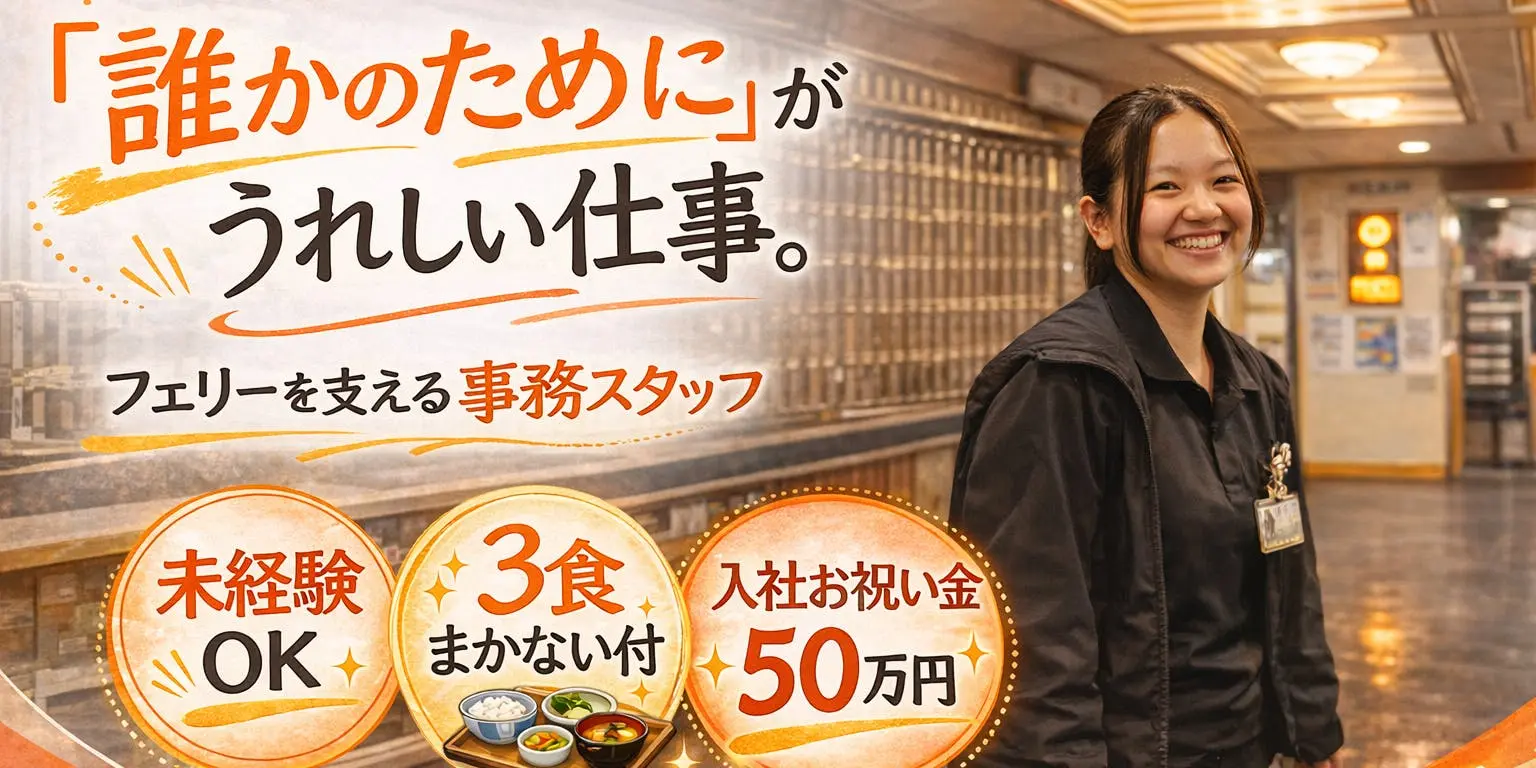 島根県隠岐諸島と本土を結ぶ隠岐汽船で、乗船手続きやお客様対応、船内サポートを担う事務スタッフを募集。観光だけでなく、島民の通院、通学、物流、帰省など、島の暮らしを支えます。特別な資格や経験は不問、未経験歓迎。3食まかない付きで、入社お祝い金(未経験の場合は50万円)など充実した待遇も整っています。