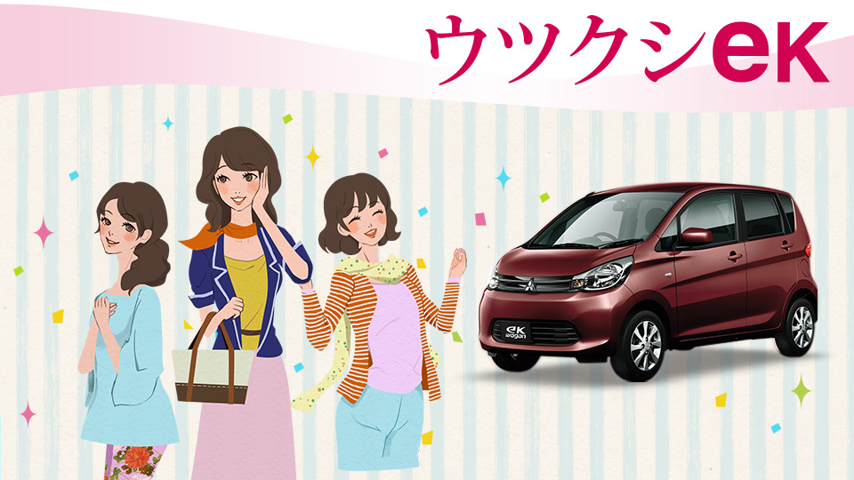 「eKワゴン」の持つ女性に嬉しい数々の機能を7点の特長に沿って、お悩みの声に応えるかたちで紹介。女性のイラスト、リポンやキラキラを散りばめたデザインで、雑誌をパラパラめくるように読めるサイトにしました。