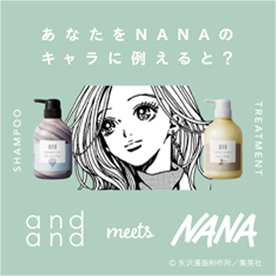 花王さんが展開するシャンプーとトリートメントを自由に組み合わせるヘアケアブランド「and and(アンド アンド)」。矢沢あいの伝説的人気漫画『ナナ(NANA)』と、ヘアケアブランド「and and」がコラボした体験コンテンツ「“あなたをNANAのキャラに例えると?”#andandmeetsNANA」の設計・TwitterDM開発をカヤックでお手伝いしました。