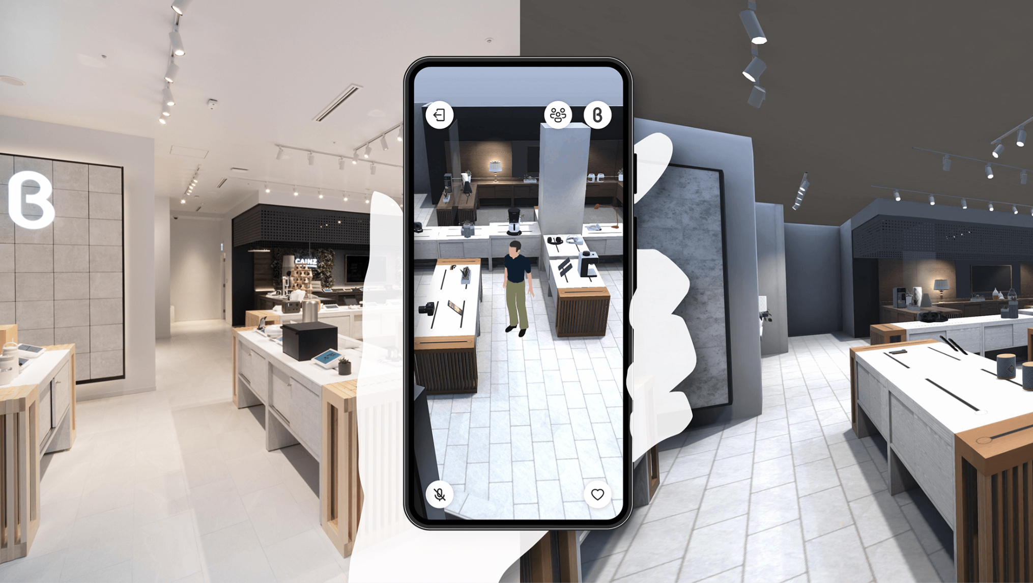 「Virtual b8ta」は、b8ta Japanが運営する「b8ta Tokyo - Yurakucho」と連携し、友人などと一緒にスマートフォンでアクセスできるバーチャル店舗や、実際の店舗に設置されたアバターロボットの遠隔操作、店頭スタッフとのビデオ通話などをシームレスに行き来できるサービスのプロトタイプです。