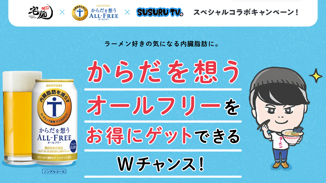 サントリーから発売されている「からだを想うオールフリー」のプロモーションとして、ラーメン通販サイトの「宅麺.com」、ラーメンYouTuberとして人気の「SUSURU TV.」とともに、本商品の認知拡大/飲用体験創出のための施策を行いました。カヤックでは、キャンペーン・タイアップ動画の企画・制作をお手伝いしています。