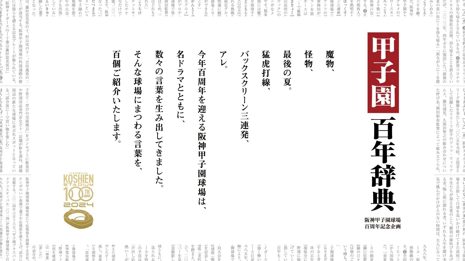 「魔物」「怪物」「最後の夏」「猛虎打線」「バックスクリーン三連発」「アレ」など、阪神甲子園球場は、名ドラマとともに、数々の言葉を生み出してきました。「甲子園百年辞典」では、そんな球場にまつわる言葉を100個紹介。甲子園に馴染みのある人だけでなく、馴染みのない人にもその歴史に触れていただけるような立て付けを考えました。
