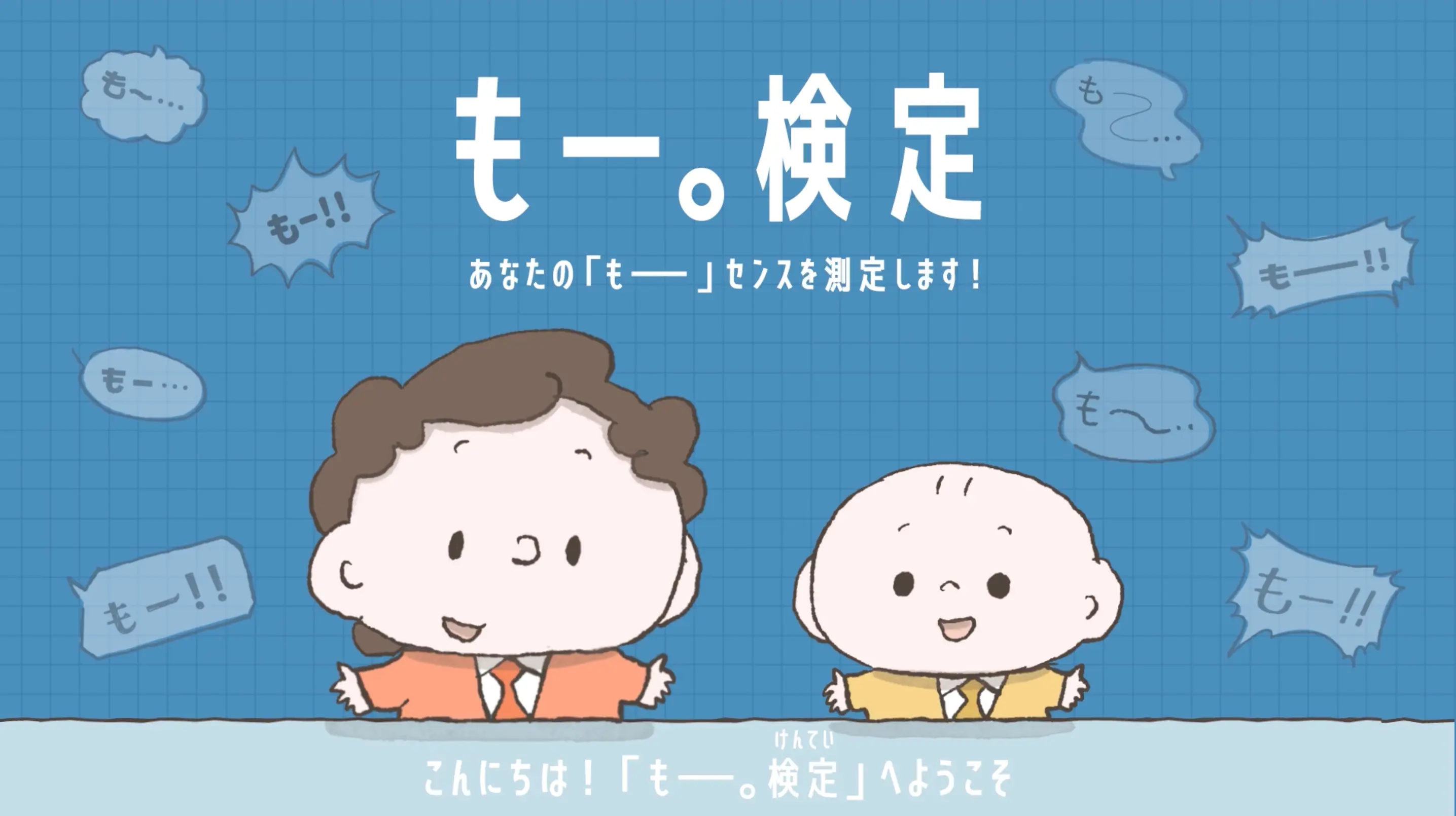 「もー。検定」は、マイクを使って「もー。」の強さを計測し、正しい「もー。」を判別するゲームです。マイクで「もー。」を発声すると、その強さに応じて「もー。メーター」が上昇、正しい瞬間に正しい大きさで言えたかどうかで判定され、ランクに分かれた合格証がもらえます。