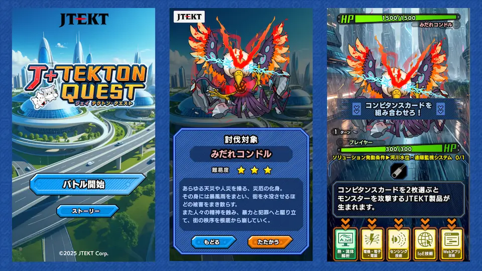 このコンテンツはジェイテクトの技術(=コンピタンス)を使って、社会課題を生み出すモンスターとのバトルに挑むカードゲームです。プレイヤーは多彩な技術を組み合わせて様々な製品を生み出し、その力でモンスターを攻略します。ゲーム中に登場するのは、すべて実在の技術や製品。遊びながら「ジェイテクトの技術がどう社会に貢献しているのか」を体験できます。
