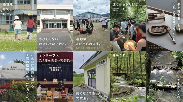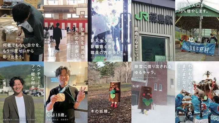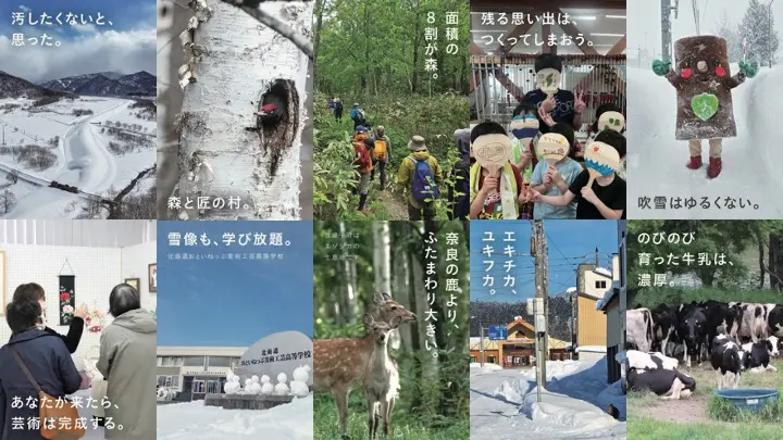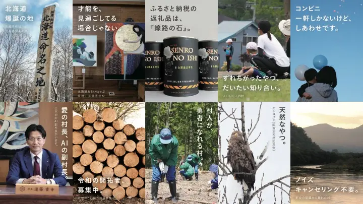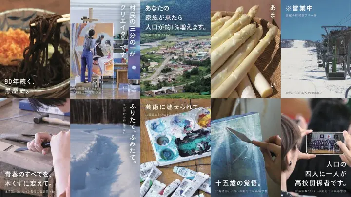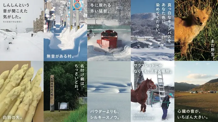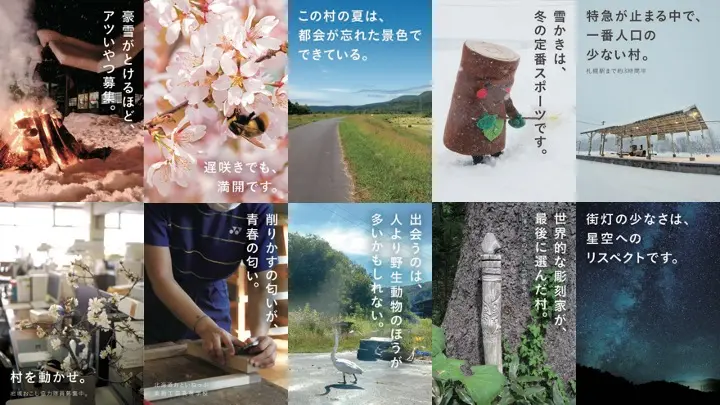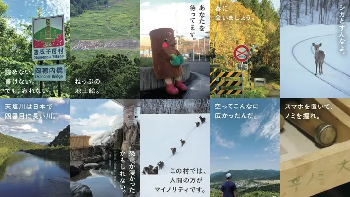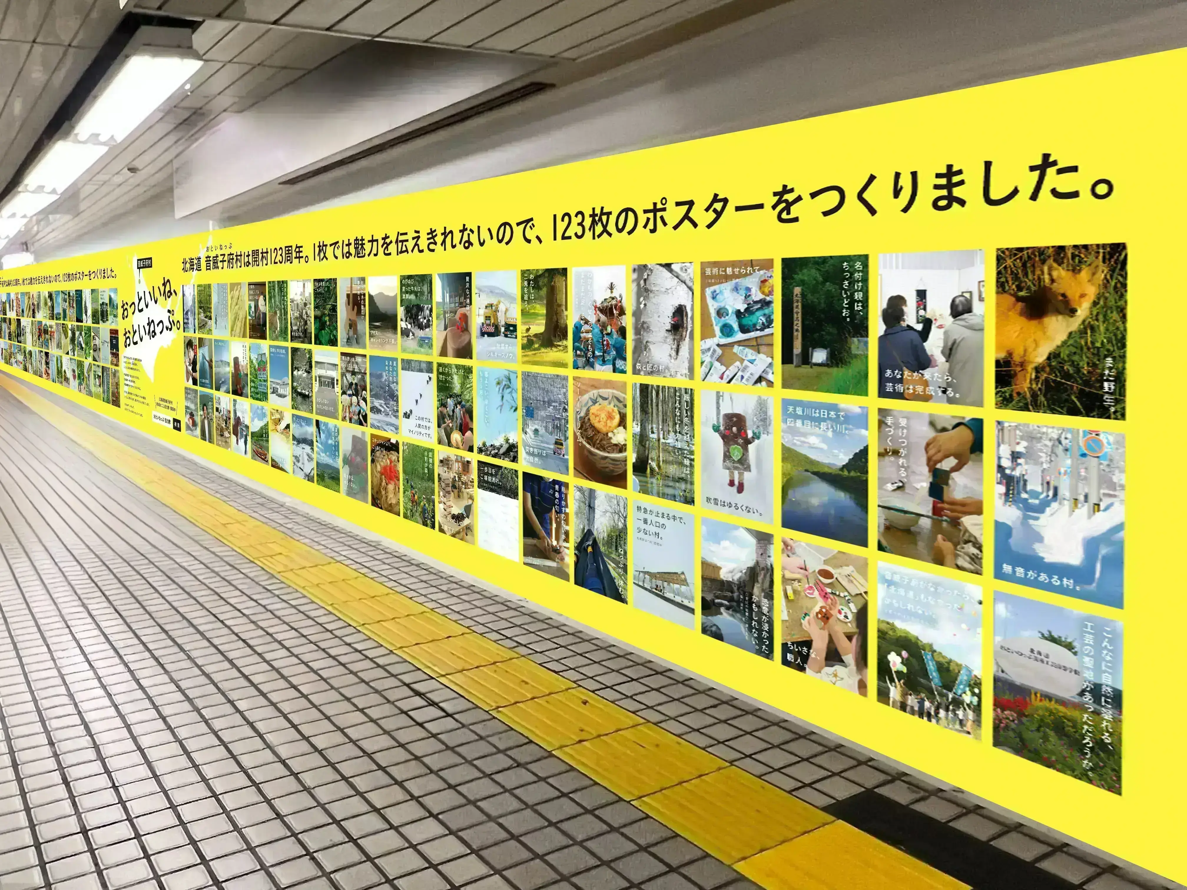 北海道中川郡音威子府村の地域おこし協力隊募集に向けたPR施策として、株式会社メガ・コミュニケーションズと共同でポスター広告の企画・制作を担当しました。開村123周年にちなみ、村の写真に一言コピーを添えた123枚・全長約15mの大型広告を、小田急線新宿駅西口地下通路に掲出しました。