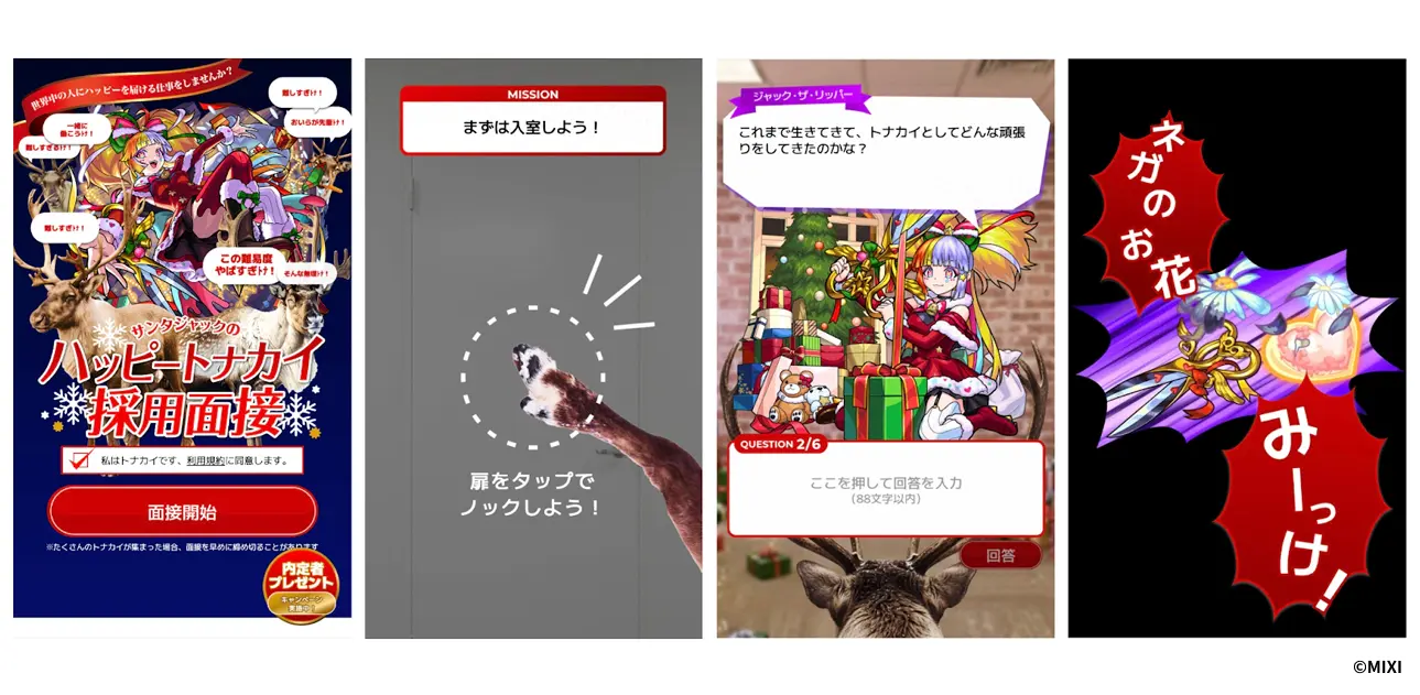 本コンテンツは、クリスマスガチャ限定でサンタの衣装に身を包んだモンストの人気キャラクター「ジャック・ザ・リッパーα」がAI面接官となり、トナカイを志望するユーザーを面接するチャットボット形式のゲームとなっています。