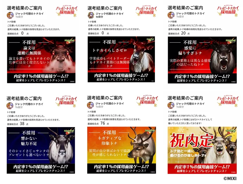 不採用時には、先輩トナカイからの辛辣かつユニークな「お祈りメール」が届く演出も用意し、失敗しても誰かにシェアしたくなる設計にこだわりました。